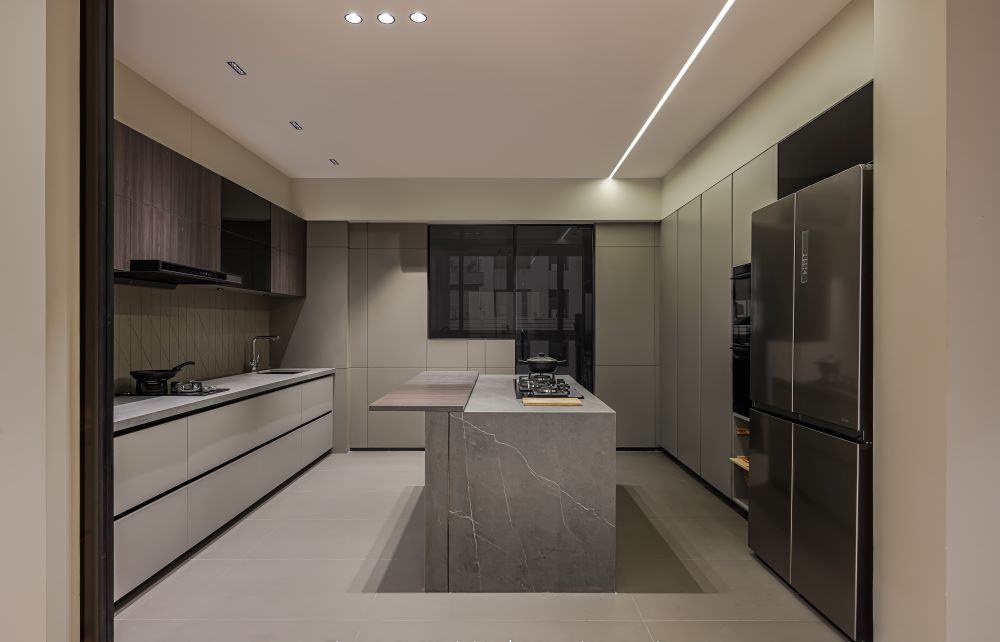 For Mr. Hitesh Shah’s residence located in Viola, Vesu, Surat, we had the pleasure of designing a sophisticated modular kitchen spanning approximately 5,600 sq. ft. in collaboration with the esteemed architectural firm, Ar. The Interior Workshop. The kitchen’s design focuses on a perfect blend of aesthetics and functionality, featuring premium Fenix fascia in the base unit cabinets, known for its durability and sleek, fingerprint-resistant surface. Complementing this, the wall unit cabinets showcase Matt Marica fascia, adding a subtle elegance and modern touch to the overall kitchen ambiance.