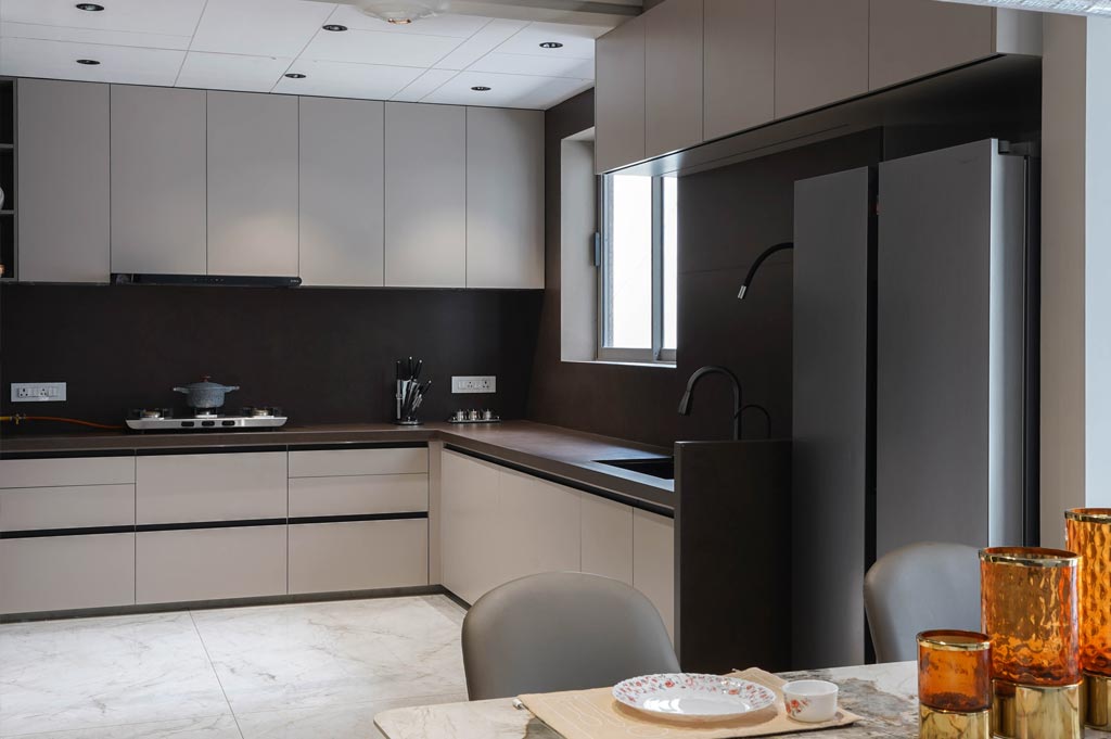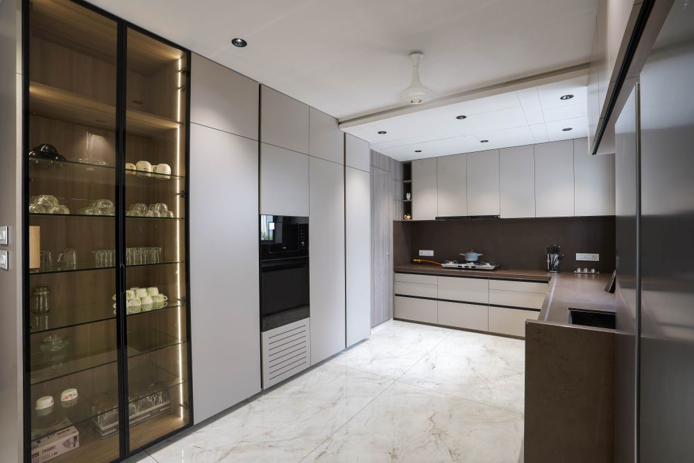 For Mr. Mayank Patel’s bungalow located at Artham Vatika, Althan, Surat, we designed a stylish and highly functional modular kitchen within a built-up area of approximately 200 sq. yards. Collaborating with Ar. Akash Architect, the kitchen features premium Fenix fascia finishes known for their durability, matte texture, and resistance to fingerprints, ensuring both elegance and practicality. A standout element of this design is the crockery unit, which is adorned with a sophisticated brown tinted glass fascia, adding a rich, contemporary accent that elevates the kitchen’s overall aesthetic.