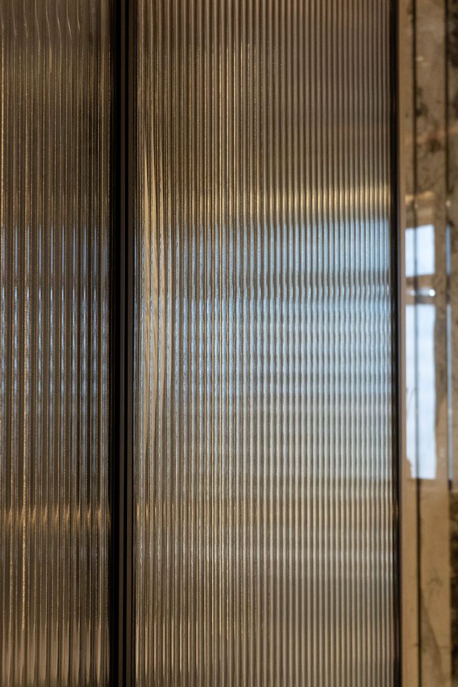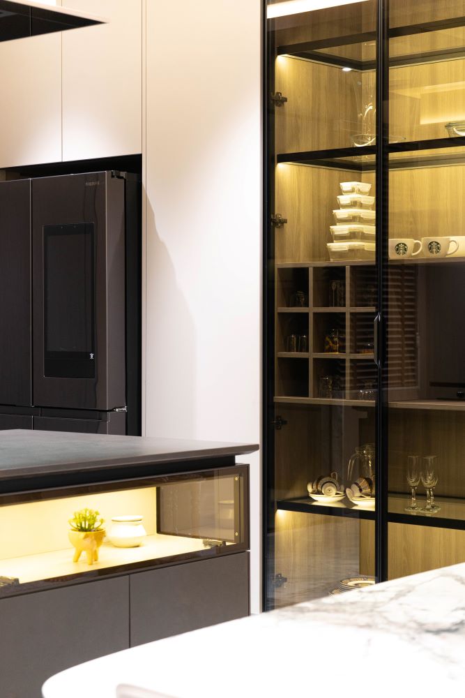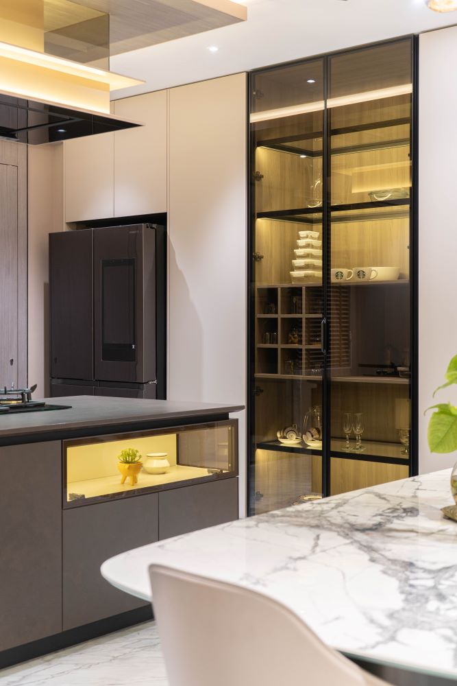 The modular tall unit is equally captivating, featuring a matte Marica and UV Farbe lacquered finish for a luxurious appeal. Horizontal pull-grip handles add subtle elegance, while the hidden bar zone inside the tall unit exemplifies smart design. Fluted glass shutters complete the storage unit’s stylish yet functional look, ensuring that every detail aligns with modern living standards. This project is a fine example of how thoughtful design and premium materials can create a harmonious, luxurious living experience.