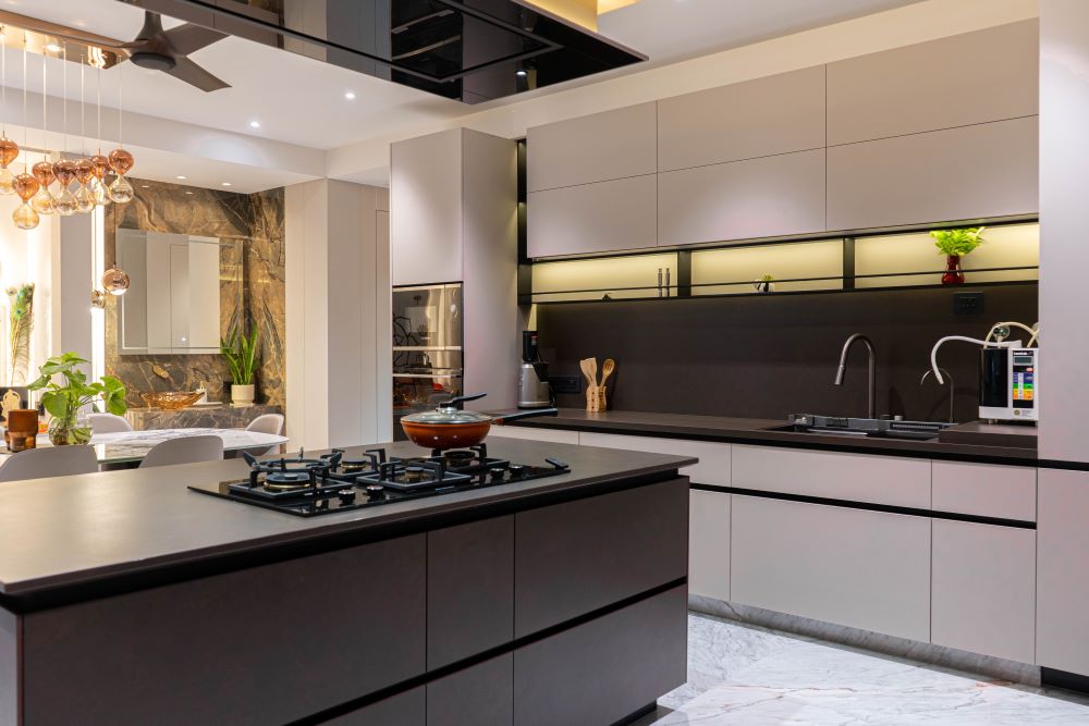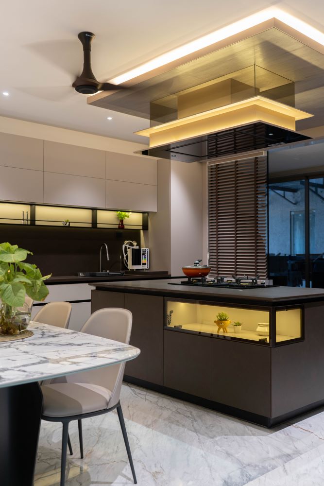Located in the prestigious Rajhans Cremona on VIP Main Road, Surat, this 4500 sq. ft. project is a brilliant showcase of modern design and premium functionality. Executed by Akash Architect for Sagar Patel, the space embodies the perfect blend of aesthetics and utility. The modular kitchen stands out with its striking Dekton island complemented by a decorative glass unit. Fluted matte glass profile shutters and Fenix cabinet shutters elevate the kitchen’s contemporary charm, offering a seamless and durable finish that resonates with sophistication.