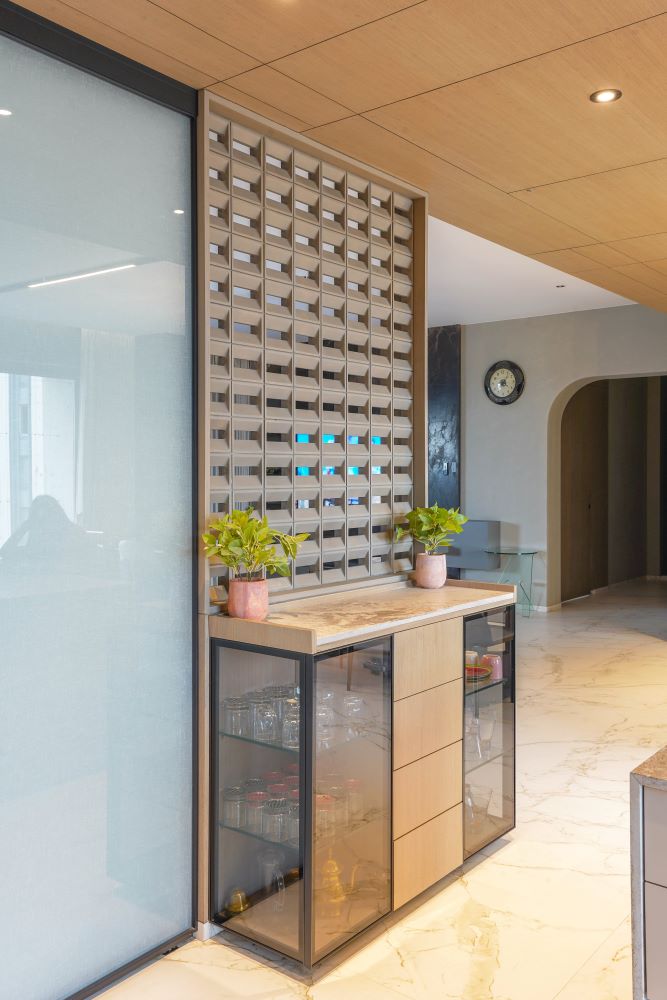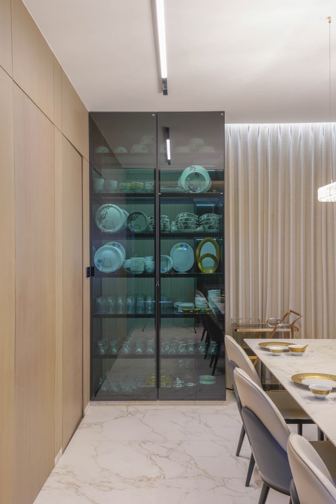 The crockery unit is a standout feature, designed with Euro grey-tinted profile shutters that add a subtle sophistication and complement the overall aesthetic. Every detail has been meticulously crafted to combine visual appeal with ergonomic functionality. This project exemplifies the seamless integration of high-quality finishes and thoughtful design, creating a kitchen that is as stunning as it is practical for modern living.