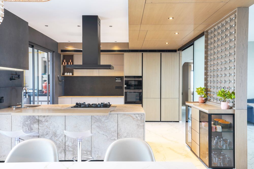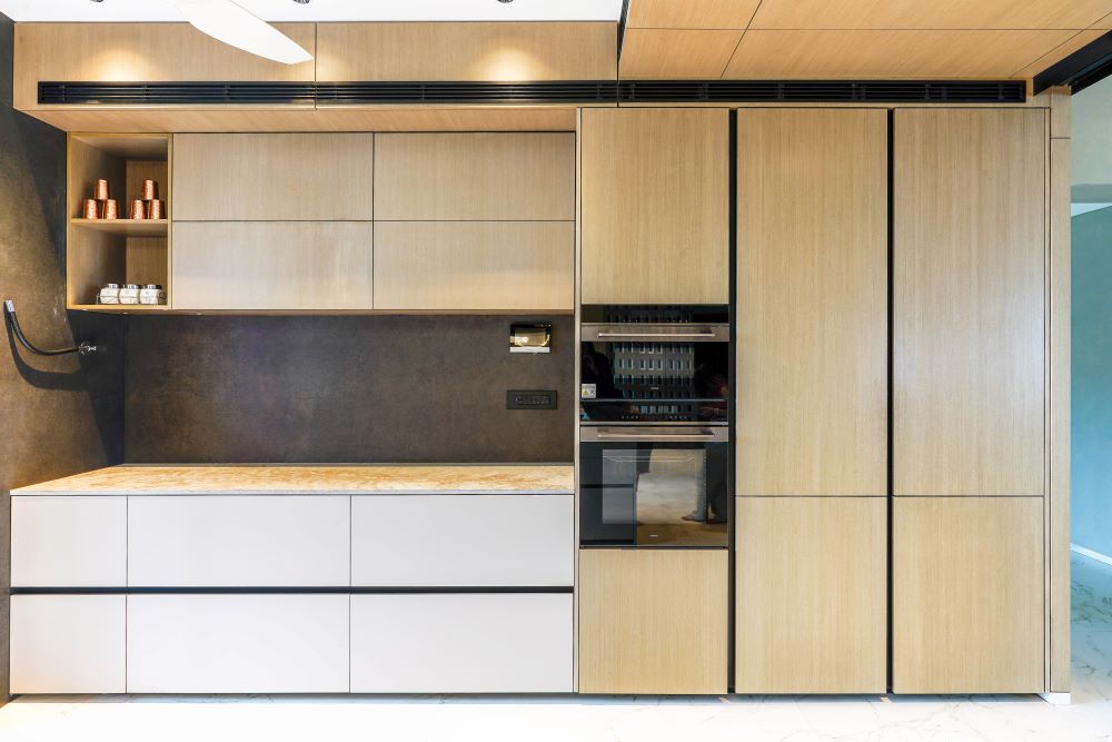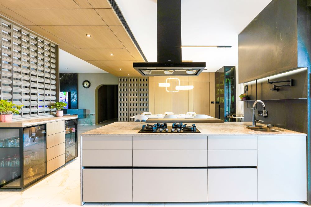 Situated in the prestigious Casa Rivera, Adajan, Surat, this 6400 sq. ft. modular kitchen project for Tushar Bhai embodies modern elegance and functionality. Designed by Studio Seventeen, the kitchen showcases a harmonious blend of premium materials and innovative design elements. The centerpiece is the Caesarstone island, exuding a luxurious appeal while offering exceptional durability and practicality. The kitchen features a mix of Fenix fascia shutters, veneer fascia shutters, and glass profile shutters, delivering a sleek, contemporary look with versatile textures.