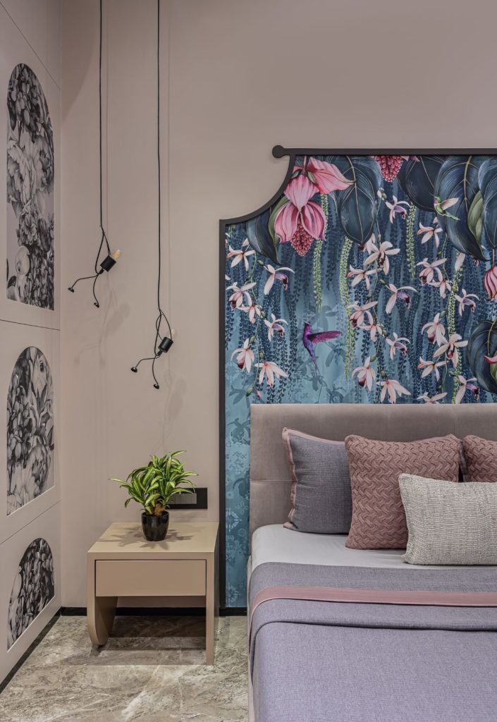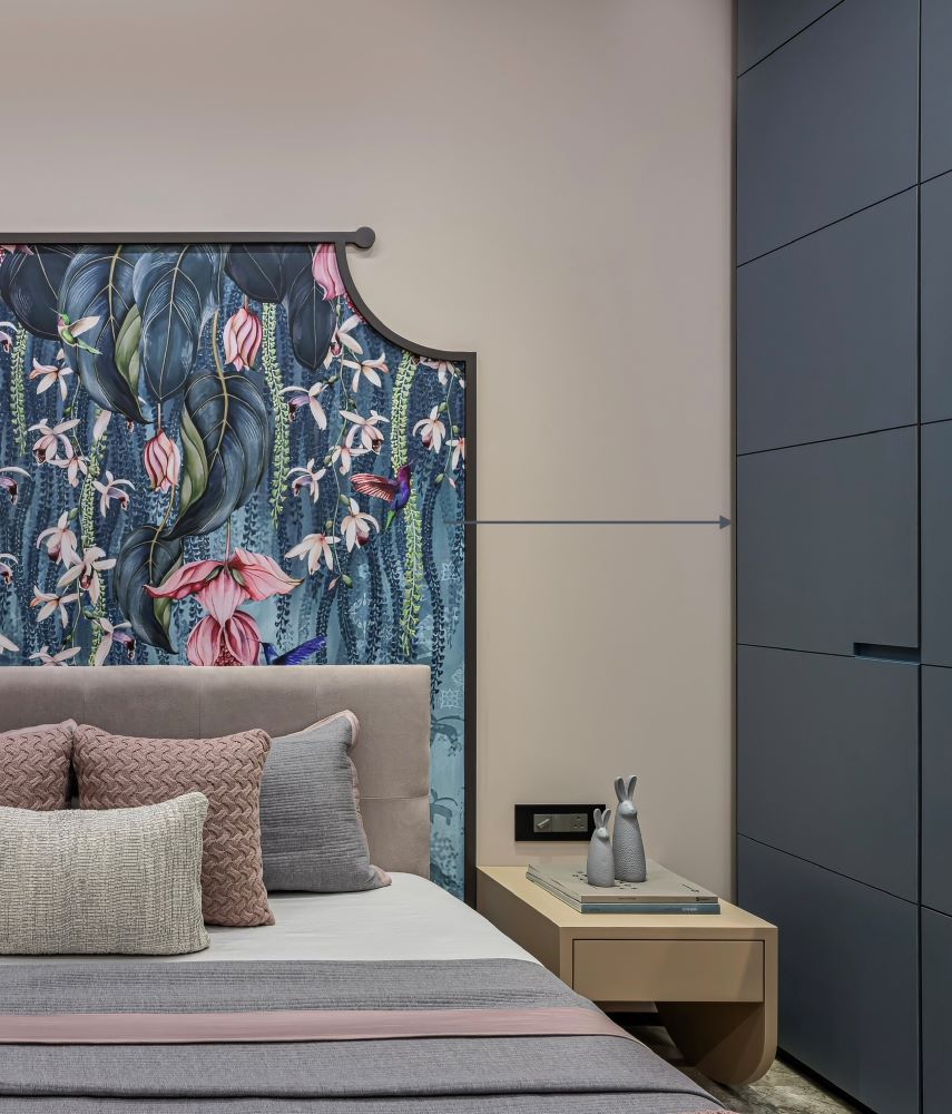 The TV unit is designed with Matt Marica finish and includes a metallic sleek niche unit, providing both aesthetic appeal and functional storage. This carefully curated combination of materials and finishes reflects a thoughtful approach to creating a harmonious and stylish bedroom environment. The overall design balances modern trends with practical needs, resulting in a refined space tailored to Mr. Vrath Seth’s taste and lifestyle.