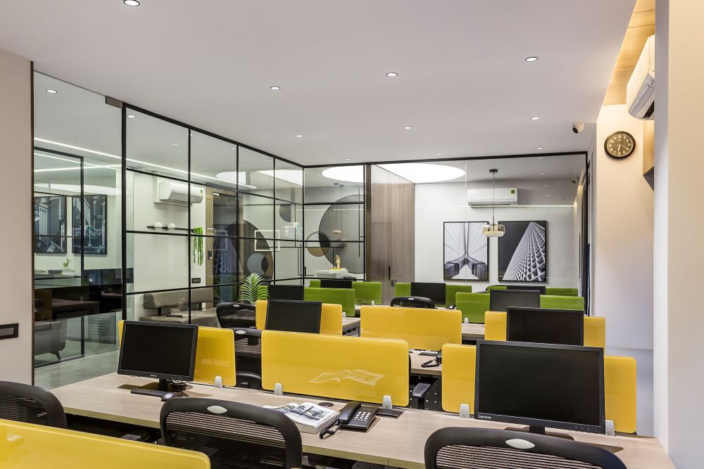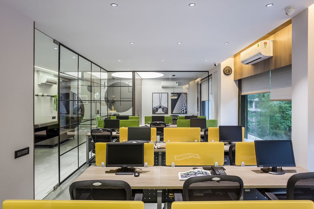 The Wonder Block workspace on Ring Road, Surat, is a seamless blend of style and functionality, crafted under the expert guidance of Ar. Adda Architects. Spread across 3200 sq. ft., this modular office design embodies a modern aesthetic while prioritizing operational efficiency. The tables and storage units, finished in UV Farbe lacquer, exude a polished and vibrant appeal, creating a professional yet welcoming environment. The staff tables, adorned with a Matt Marica finish, offer a subtle and elegant touch that complements the overall design theme.